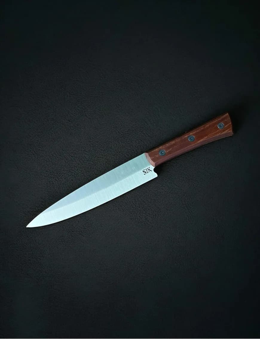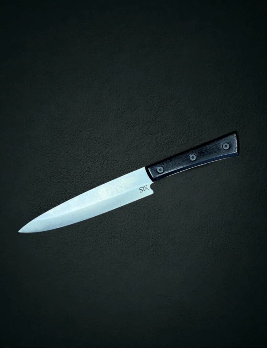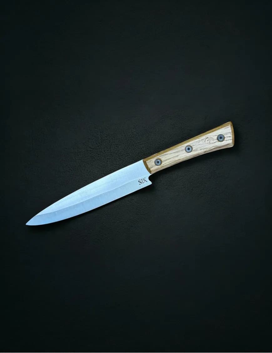Forged from stainless steel EN 1.4116, hardened to 58–59 HRC, and ground to just 0.2 mm behind the edge, this blade cuts through meat, fish, and vegetables with fluid precision. Each knife is hand-sharpened to a razor edge that stays keen even after long sessions of food prep.