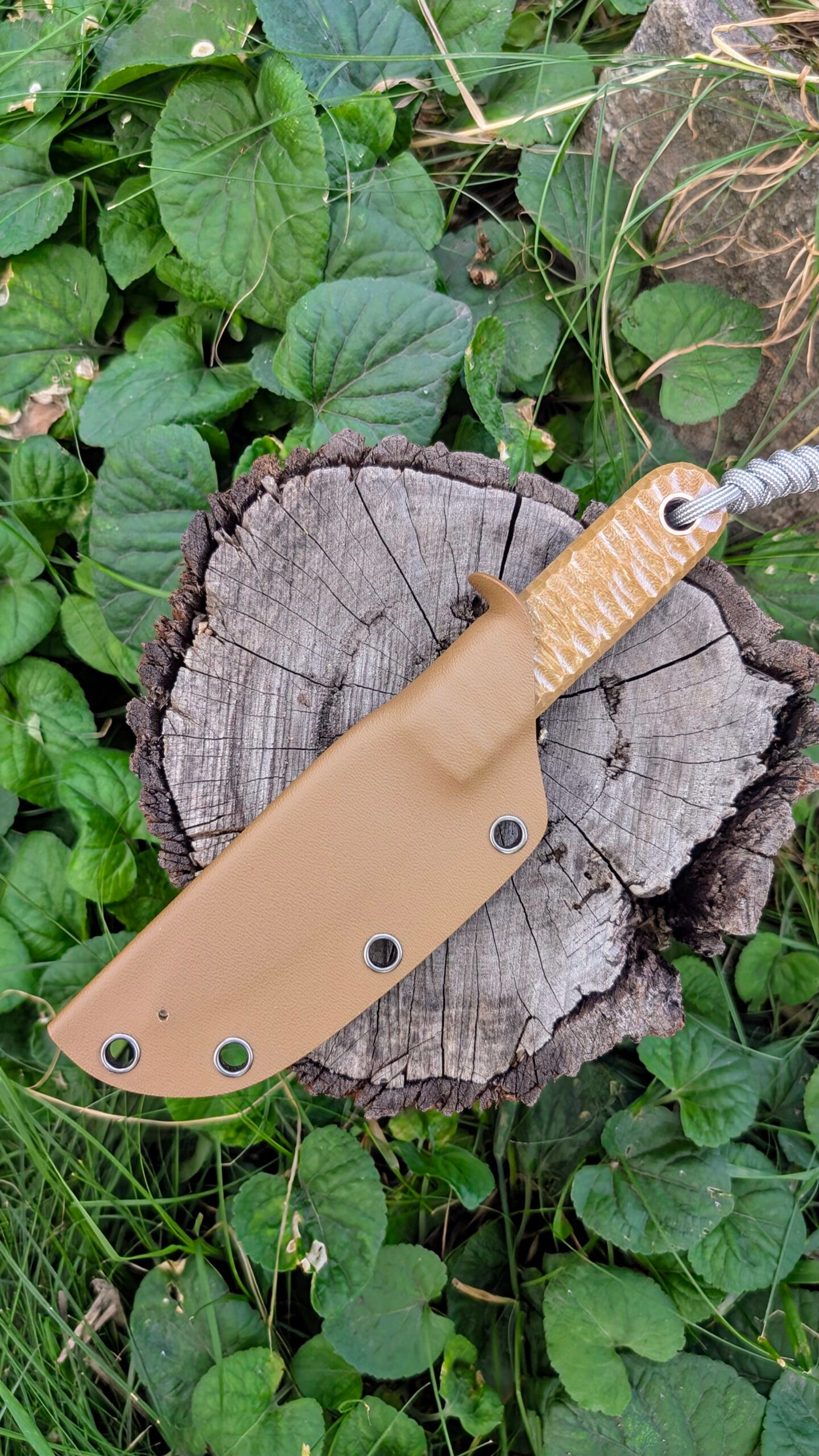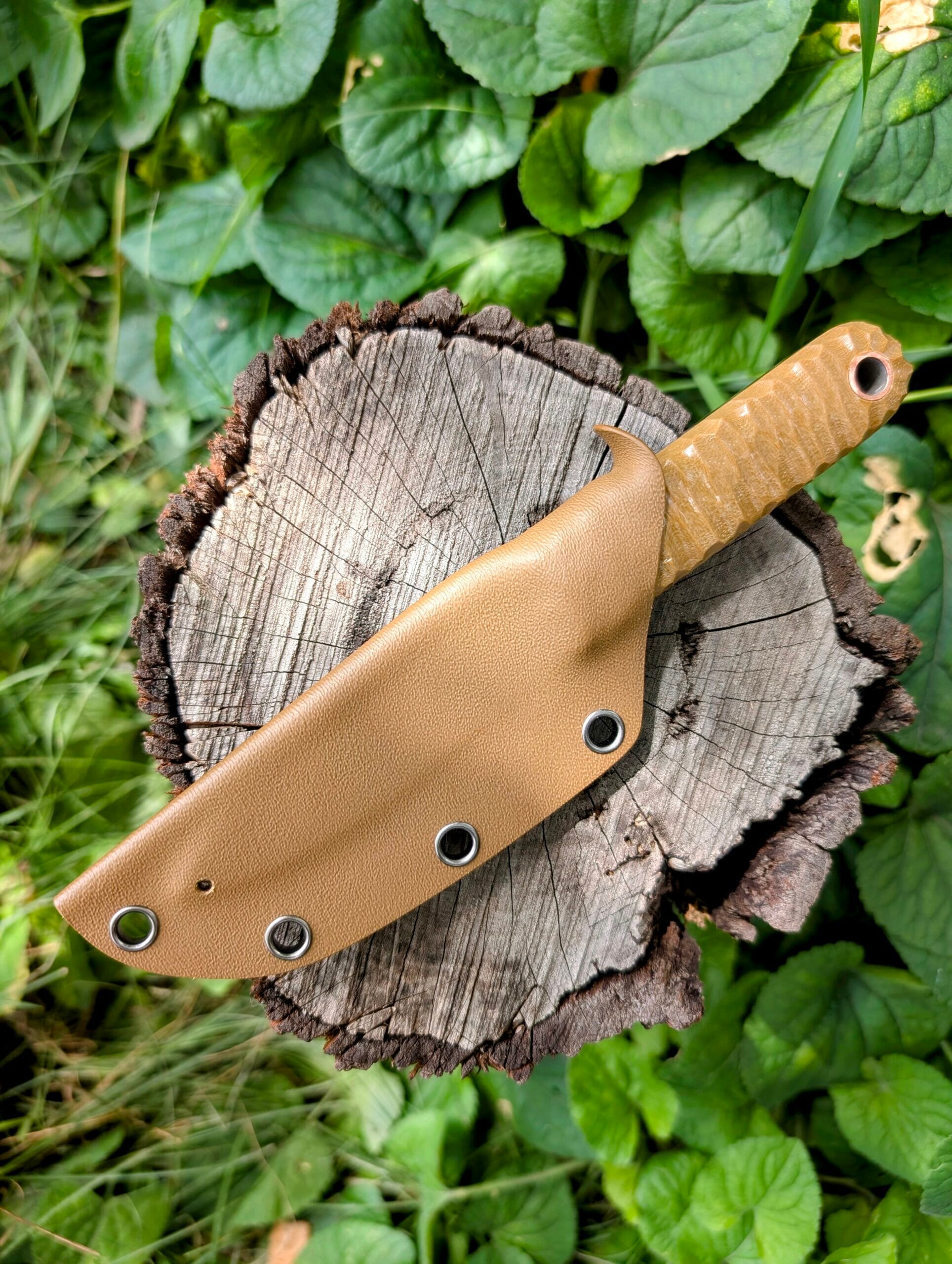 Despite its compact form, the Mowgli delivers confident performance. Its refined blade geometry, premium heat treatment, and clean edge make it a dependable tool for everyday tasks, camp chores, food prep, or quick utility cuts in the wild. The handle shaping gives a natural, comfortable grip, while the materials add individuality and strength.